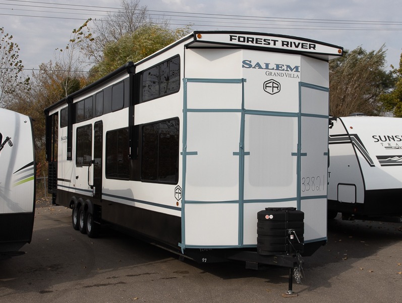 With any Salem Grand Villa destination trailer by Forest River, you can call home wherever you park it! There is a heated and enclosed Accessibelly for added protection in all seasons, LED "Blade Lighting" under the awning, Lippert On-The-Go ladder prep, plus many more exterior conveniences. Elegant curtain rods and curtains will have you feeling right at home, along with stainless steel kitchen appliances, stylish roller shades, and enhanced floating shelves for added storage. Each model includes a central vacuum with a sweep attachment to help keep your space tidy, a 60k on-demand tankless water heater for endless hot showers, a JBL 3-Zone media center, plus available options to further customize your trailer.