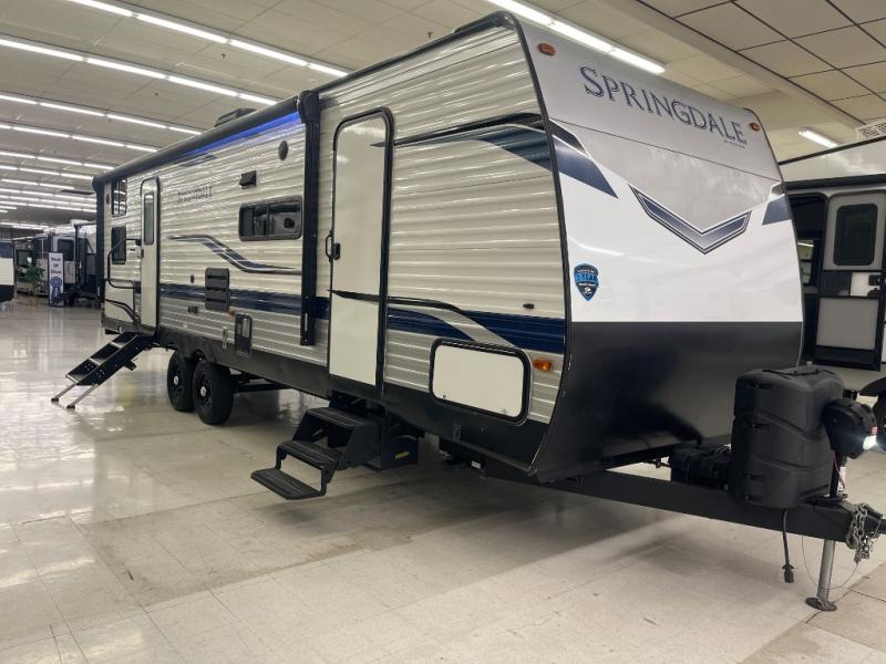 With any Keystone Springdale travel trailer, you will have a friction hinge entry door with sturdy LCI SolidStep steps, a pass-through storage compartment for your outdoor gear, and reliable Dexter E-Z Lube axles to maneuver your Springdale down the road and into the campsites. Some of the Keystone Exclusives provide 12V color-coded wiring with easy-to-trace circuits which is better than conventional RV wiring allowing a faster diagnosis for quicker repairs, and the streamlined heat distribution that uses in-floor heat vents for more efficiency for uninterrupted air flow. Also included, the Blade high performance air flow system that delivers 30% more air flow. The interior gives you pressed kitchen countertops, pleated night shades, and designer upholstered window valances for easy care and style, and more depending on the Springdale you choose!