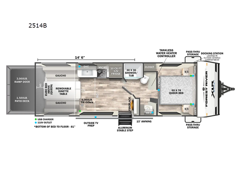 This toy hauler with a 14' 6" garage is sure to meet all your camping needs! Once you unload using the 3,000 lb. capacity ramp door, you can enjoy the 1,500 lb. capacity patio deck and enjoy a cold drink. There is seating space on the dual gaucho sofas with a table in between, and your guests can sleep on the queen-size Euro bed lift above. A full kitchen lets you cook meals each day, and the fireplace will make your space feel more like home. There is a walk-thru bath that leads to the front master bedroom where you'll find an RV queen bed, dual wardrobes and nightstands plus a closet to keep clothes wrinkle-free!
