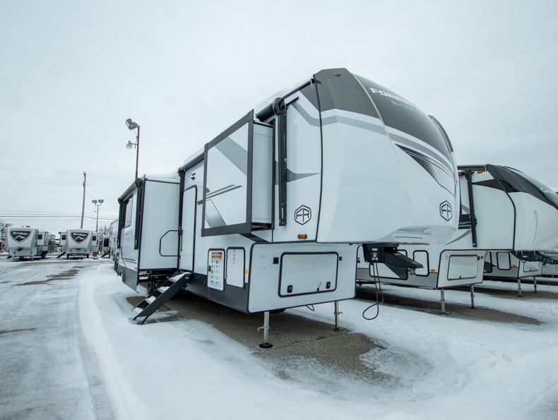 You will find the perfect balance of size, space, features, and luxury with any one of these Forest River Sandpiper fifth wheels! They have a cambered powder coated frame with rust prohibitor, and a fully enclosed underbelly for added protection against the elements. Also, the power front jacks with spring-loaded pins enhance the convenience, speed, and safety. The large, tinted windows come with a 80/20 UV prohibitors. Some hassle-free amenities include a 60k BTU on-demand water heater, porcelain foot flush toilet(s), tire pressure monitor system, and an electric leveling system! Inside, you'll enjoy stainless steel kitchen package, solid surface kitchen countertops, Beachside Sundance Congoleum linoleum, recessed residential lighting, and many more comforts!