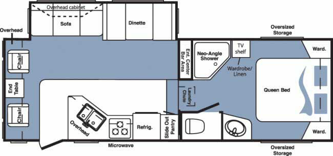 Single Slide, Rear Living Space w/2 Chairs & End Table, Sofa & Booth Dinette Slideout, Overhead Storage, Double Kitchen Sink, 3 Burner Range, Refrigerator, Pantry, Ent. Center/Bar Area, Neo-Angle Shower, TV Shelf Above Wardrobe/Linen Cabinet, Private Toilet Area, Front Queen Bed w/Wardrobes, Overhead Storage & More.