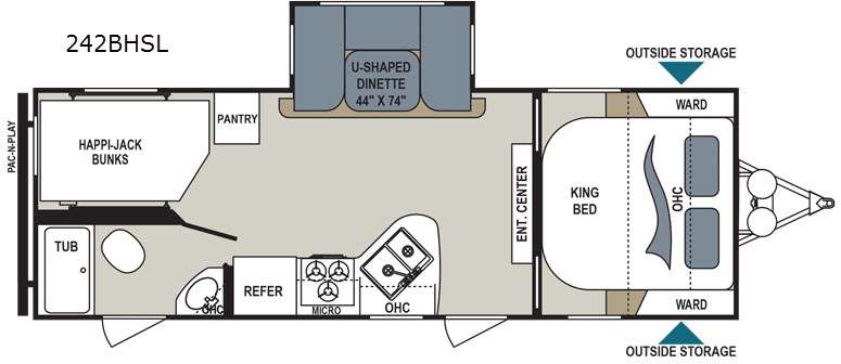 A rear corner bath features a convenient tub/shower, a toilet, and a vanity with sink, plus a private entry door that makes it easy to access from the outside. The opposite corner is where you will find the happi-jack power bunks that will be perfect for the kids at night. The Pac-n-play door makes it easy to stow away things from the outside of the travel.