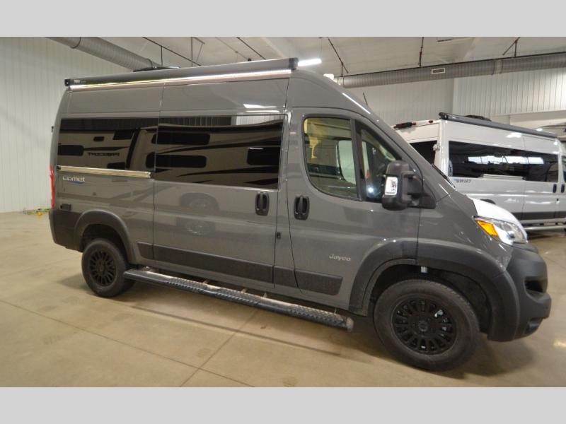 The small and nimble Comet Class B gas motorhome by Jayco is ready for adventure when you are! You'll appreciate the RAM ProMaster 1500 cargo van chassis for a strong and durable foundation, and the 17' 10" overall length means you can easily squeeze into parking spots even in the big city. There are added safety features for your peace of mind, like the LaneSense lane departure warning, drowsy driver detection, and forward collision warning with active braking. An Aqua-Hot GEN-1 hydronic water and heating system will provide hot water and heat when you need it. You'll be surprised by the interior comforts and functionality found in this compact camper van, including a convertible sofa/bed, residential vinyl flooring, swivel seats, and an adjustable table with multiple mounts to name a few!
