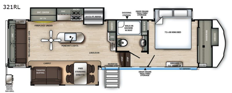 Any couple would love having this fifth wheel at the campsite with triple slides offering a spacious interior, extra sleeping space on the furniture for any overnight guests, and all the storage inside and outside for those longer trips. The cook will enjoy preparing and serving meals on the oversized kitchen island with solid surface counter space and a sink to keep everything clean. The residential refrigerator and the floor to ceiling pantry can hold all of the cold ingredients, paper goods, and snacks necessary to keep everyone fed. The free standing table with four chairs offers a great place to dine and work, and the theater seats along with the rear tri-fold hide-a-bed sofa offer a place to visit and enjoy the 50" LED HDTV with cozy fireplace below. And the drop down pass-through storage, the 16' electric awning and the bumper mount swivel gas grill give you more living, storage and cooking space.