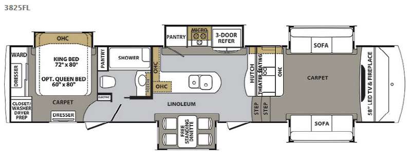 As you enter the fifth wheel, step up to the right to a front living area. There are two slides, one on either side of the fifth wheel. Both slides have a comfortable sofa. There is also theater seating with overhead cabinets, and along the front wall you can watch TV on the 58" LED TV and enjoy the fireplace just below.