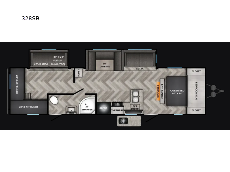 With dual entry doors, you will experience a smooth flow of traffic in and out of this travel trailer! The rear private bunkhouse includes two sets of bunk beds plus a fifth bunk over a jack knife sofa, so your kids can invite a few friends to come along. Across from the full bathroom is a linen closet to keep your towels close by and a U-shaped dinette to enjoy your meals at, play games, and even transform into an extra sleeping space. At night you can either relax on the 60" jackknife sofa by the fireplace or head to the front private bedroom and lie down on the 60" x 74" RV queen bed with closets on either side to keep your clothes looking their best!