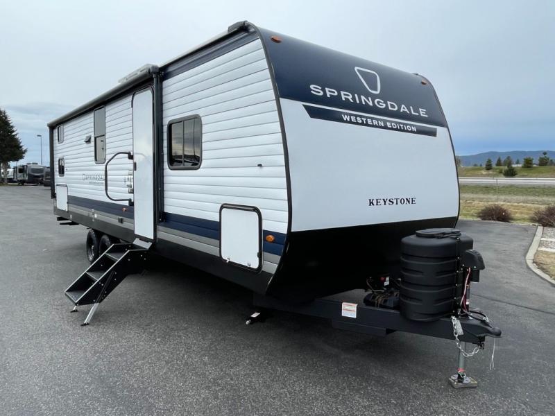 The Springdale Classic travel trailers by Keystone will provide you and your family many great outdoor experiences and it will also be kind to your pocketbook. Each one is constructed with a walkable roof, Solid Step entry steps and tinted safety glass windows. There are also heavy-duty stabilizer jacks, along with an outside shower, a power awning with LED lights, and Furrion backup camera prep. Inside, you'll find blackout night shades, pressed membrane premium countertops, a stainless-steel sink, and LED lighting to keep your space well lit.