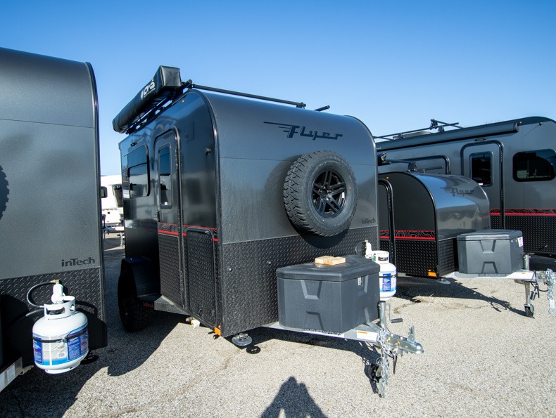 The inTech RV Flyer travel trailers and toy hauler expandables are ready for adventure whenever you are! With the all-aluminum, all-tube cage frame, the Flyer has been built with lightweight and long-lasting materials so that you can enjoy your unit for many, many years. The Flyer has a rugged design so that you can confidently explore new territory and go where traditional RVs cannot. The Flyer has a 2" rear receiver rated for 175 pounds which allows you to bring along your bikes, and the Bluetooth stereo has two speakers you can always have your best music playing. The optional roof rack will allow you to bring along kayaks, and there are more available options depending on the model you choose.